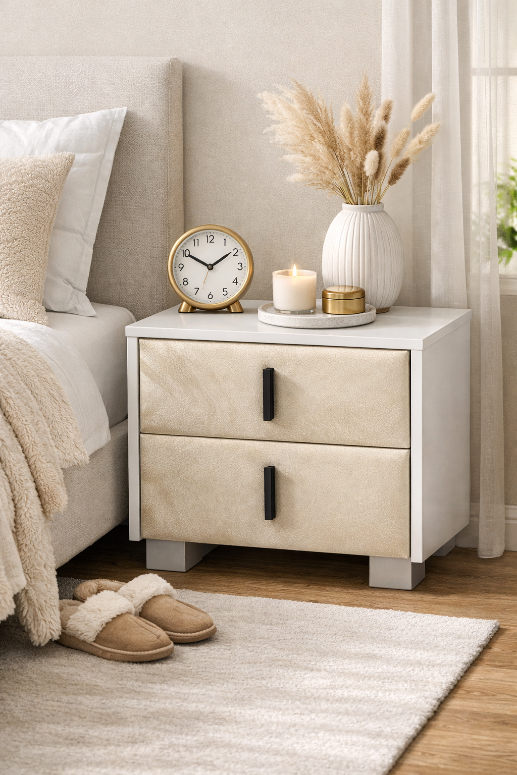Add timeless elegance and smart storage to your bedroom with the Liana Velvet Night Stand. Featuring a sleek ivory finish and a modern design, this night stand perfectly complements any bedroom style while keeping your essentials organized and within reach.